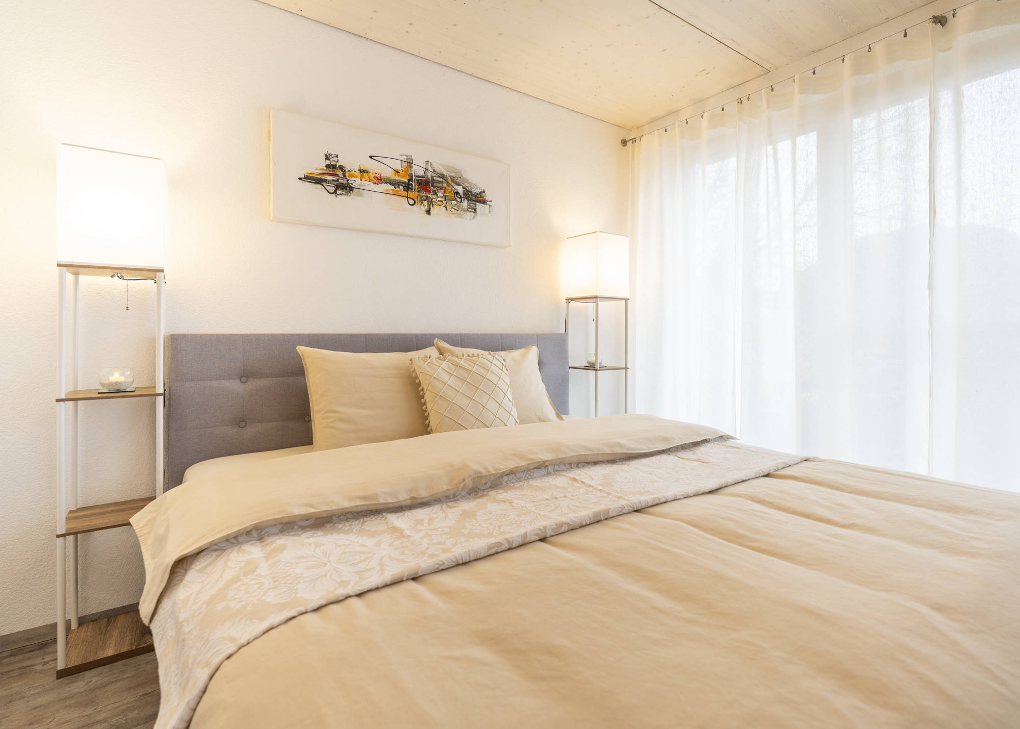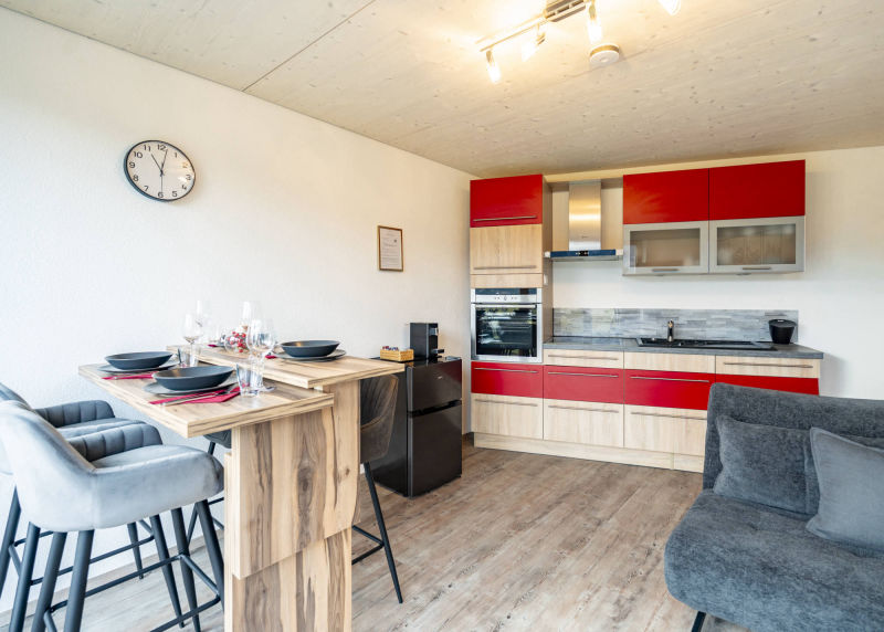 The apartment offers a separate bedroom and a bright eat-in kitchen with a sofa bed for two additional guests. This provides ample space for two to four guests without feeling cramped.