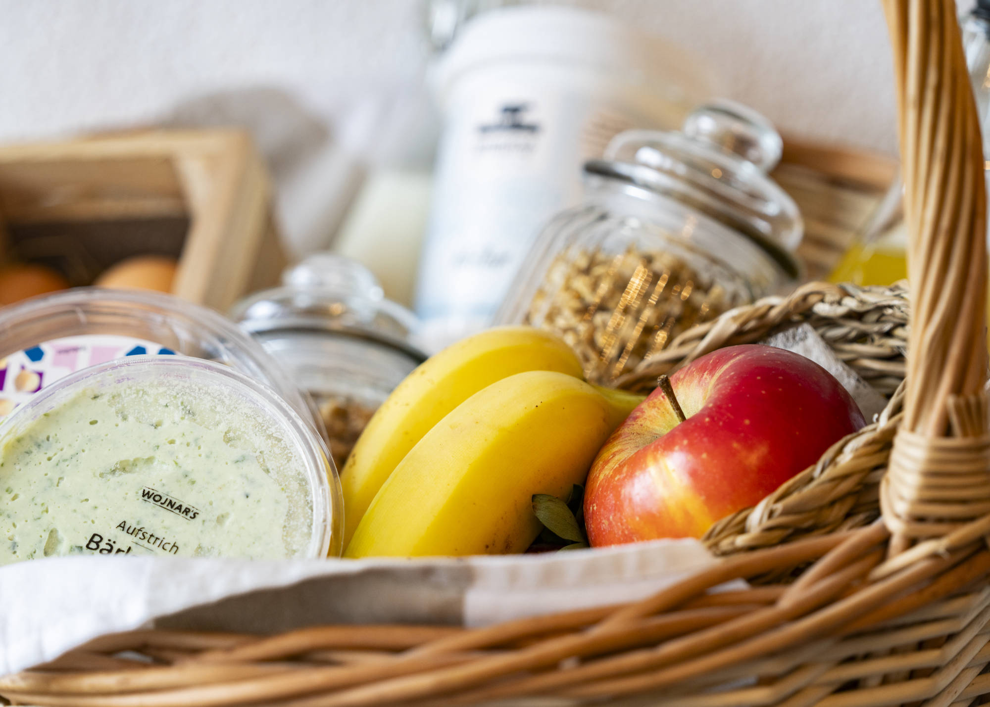 Our Mira Vista breakfast basket includes coffee and tea, bread rolls, homemade jams, butter and eggs from the farmer, fruit & vegetables, as well as fruit juice and milk, various spreads and muesli variations.