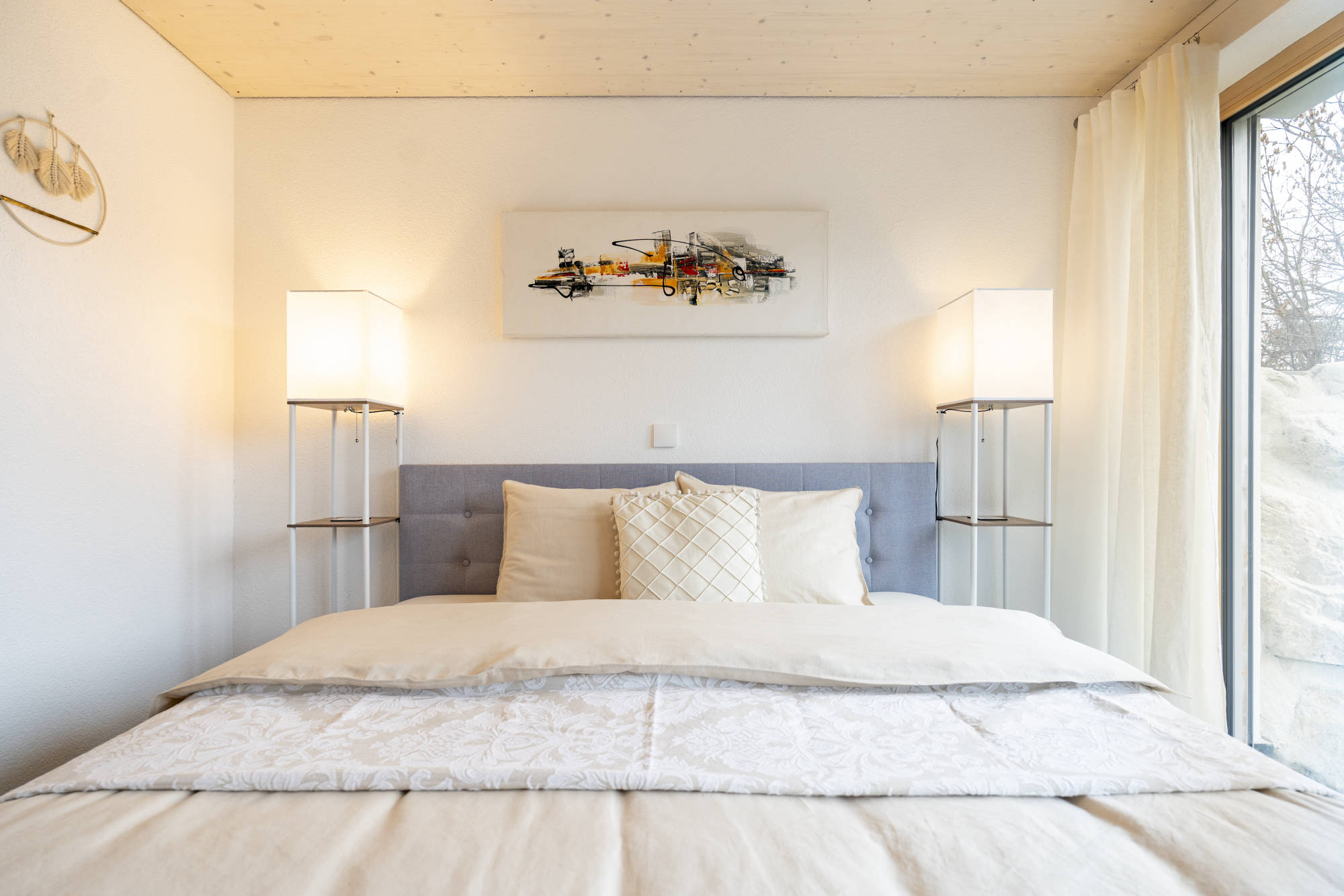 In the bedroom you will find a comfortable box spring bed measuring 180 x 200 cm.